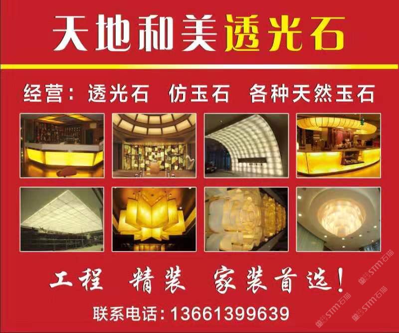 天地和美建材(北京)有限公司專業(yè)生產(chǎn)透光石、雪花石、美潔石、鳳凰石、真藏石、植物標(biāo)本生態(tài)石、云石燈飾及玉石臺(tái)盆的企業(yè),本企業(yè)擁有獨(dú)立的生產(chǎn)車間,先進(jìn)、一流的生產(chǎn)設(shè)備和精湛的生產(chǎn)技術(shù),另外,本企業(yè)擁有雄厚的設(shè)計(jì)能力和生產(chǎn)制造體系,產(chǎn)品選用優(yōu)質(zhì)的材料進(jìn)行加工生產(chǎn),生產(chǎn)過程嚴(yán)格按照質(zhì)量管理體系執(zhí)行,并且已通過ISO9000管理體系認(rèn)證,從而使產(chǎn)品達(dá)到品質(zhì)穩(wěn)定可靠、價(jià)格低廉優(yōu)惠、外觀時(shí)尚大方、進(jìn)而使產(chǎn)品享譽(yù)國內(nèi)外,遠(yuǎn)銷海內(nèi)外。本企業(yè)生產(chǎn)的產(chǎn)品廣泛應(yīng)用于燈飾、透光吊燈、燈柱、地面透光柱、透光吧臺(tái)、透光背景墻、櫥柜臺(tái)面、浴室臺(tái)面、窗臺(tái)面、洗面臺(tái)、廚衛(wèi)墻面、餐桌面、茶幾等,同時(shí)產(chǎn)品具有重量輕、硬度高、防火抗磨、耐酸、耐堿、耐腐蝕、無輻射、無縫連接、透光度強(qiáng)等多動(dòng)能特點(diǎn),也屬于新型環(huán)保裝飾材料,被配套使用于住宅、別墅、酒店、會(huì)所、商場及各大大型工程室內(nèi)外裝飾等眾多場合。本企業(yè)秉承“品質(zhì)至上,信譽(yù)”的宗旨和完善的售前售后服務(wù),贏得了廣大客戶和消費(fèi)者的一致好評(píng),熱誠歡迎各界人士前來選購、批發(fā)、工程咨詢、燈飾設(shè)計(jì)、來圖來樣定做,也歡迎各界人士蒞臨指導(dǎo)。