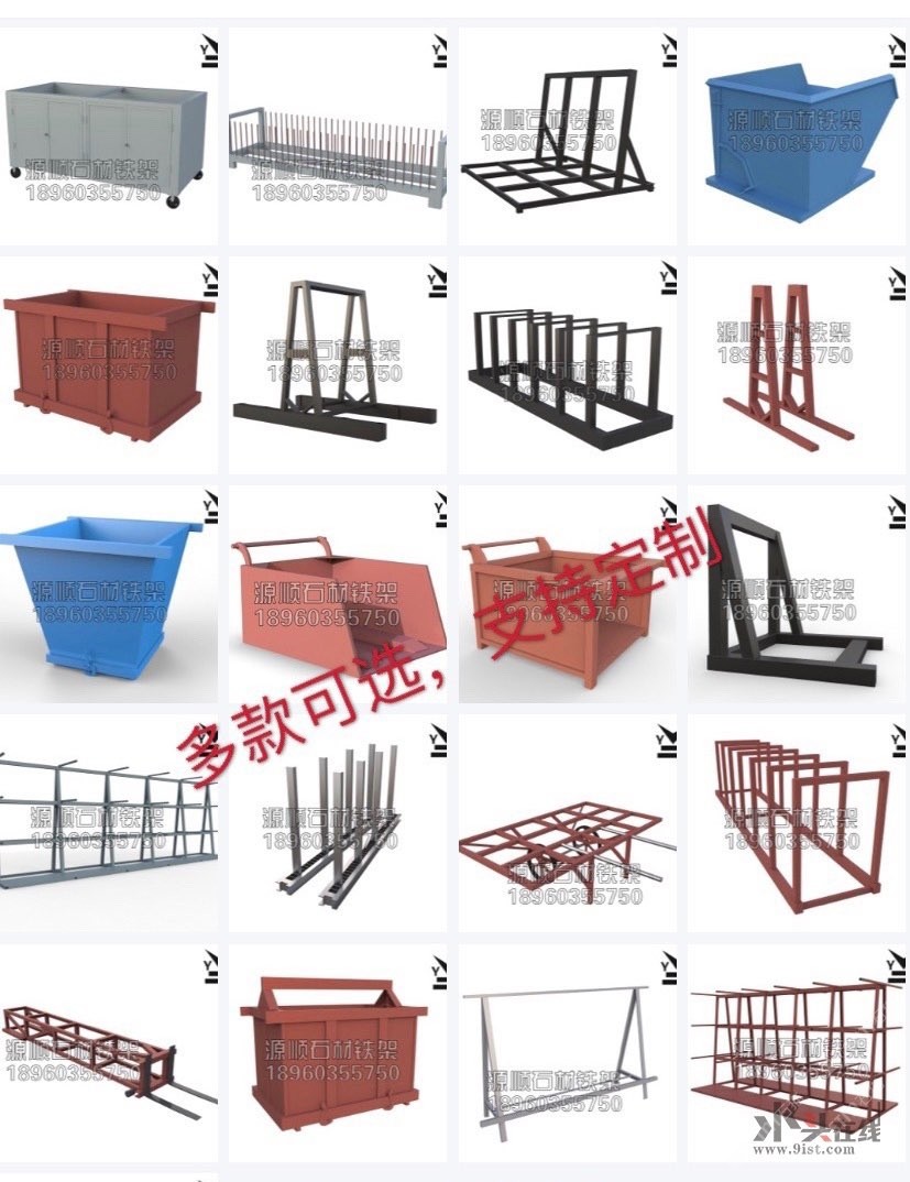 各類石材用鐵架:大板車,成品架,A字架,火車架,插桿A字架,鐵桶。
