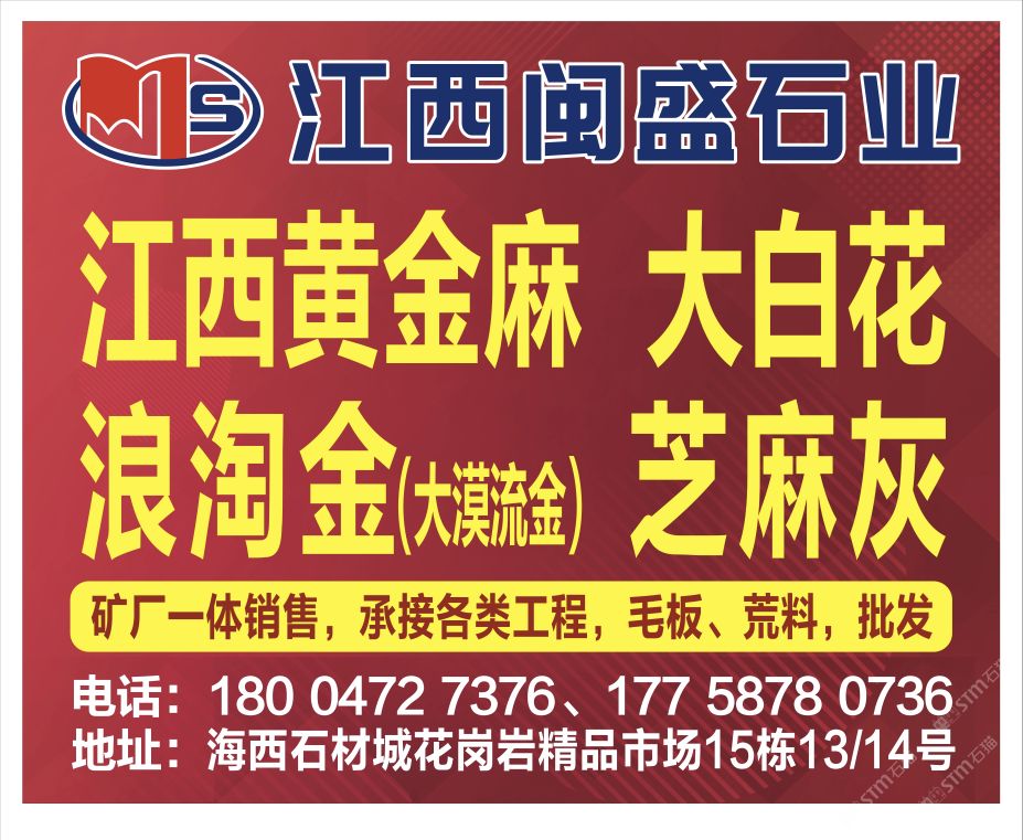 鑫山石業(yè)常年出售浪淘金(幻彩金麻),金絲麻,臺灣青,南非綠荒料,可根據(jù)客戶要求加工各種規(guī)格的薄板,延長板,荔枝板,自然板,厚板,中長板,工程板,光板,毛板,路沿石,樓梯踏步,色帶,廣場磚及自然面,荔枝面,噴砂面,火燒板等異型石材用于,高檔建筑室內(nèi)外墻面磚,地鋪石,路沿石,機拋石等,研發(fā)部門嚴(yán)把質(zhì)量關(guān),保證發(fā)貨期限,企業(yè)宗旨:“同等質(zhì)量比價格,同等價格比質(zhì)量”我廠尋求長期合作伙伴,與您攜手共創(chuàng)財富明天!浪淘金,是河北的一種優(yōu)質(zhì)黃色花崗巖,無色差,光潔度高,是裝飾內(nèi)墻、外墻、吧臺的理想產(chǎn)品,大量出口歐洲,日韓,中東等地.歡迎新老客戶來電訂購,量大價格優(yōu)惠。咨詢熱線: