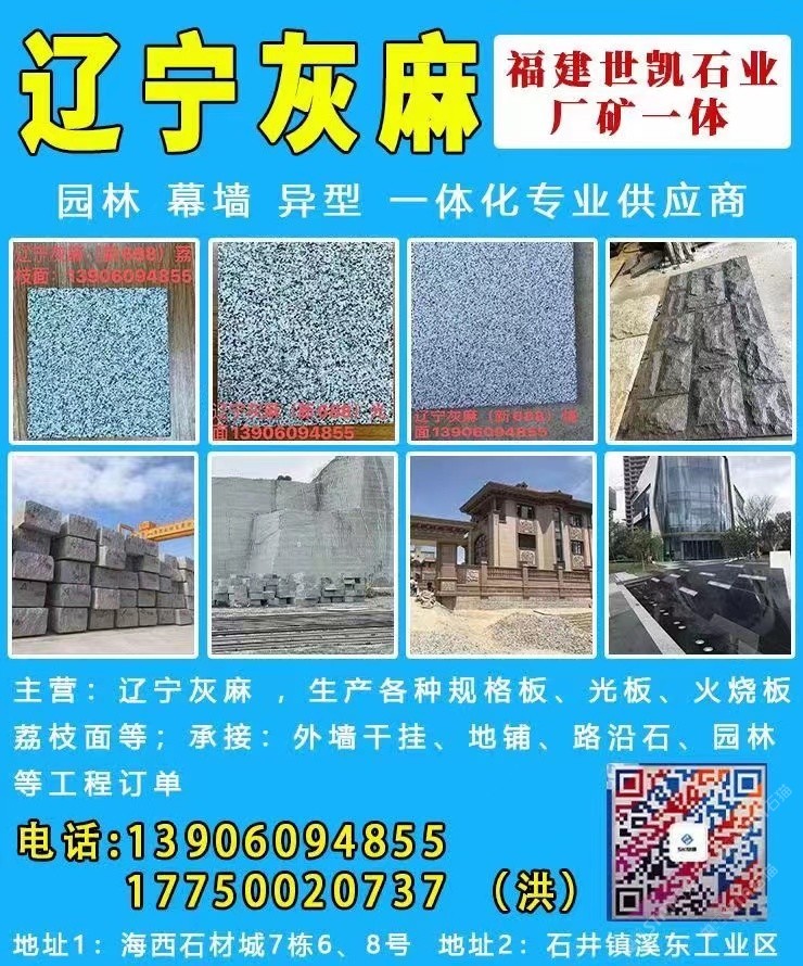 主營(yíng)石種:遼寧灰麻(新688) 、 芝麻黑(新G654) ,長(zhǎng)期儲(chǔ)存5000~10000立方荒料,滿足各大石材工程需求。從荒料開(kāi)采到成品呈現(xiàn),產(chǎn)品涉及園林、幕墻、異型等各類工程訂單,廠礦一體,公司下設(shè)荒料堆場(chǎng)部,市場(chǎng)營(yíng)銷部,工廠配備專業(yè)生產(chǎn)先進(jìn)機(jī)械設(shè)備。25年來(lái)專注于各種天然石材加工、成品、銷售?,F(xiàn)已成為專業(yè)國(guó)內(nèi)外石材供應(yīng)商,本著“誠(chéng)信為本,合作共贏”經(jīng)營(yíng)理念,為廣大客戶提供生產(chǎn)配套以及大型施工安裝一條龍服務(wù)!