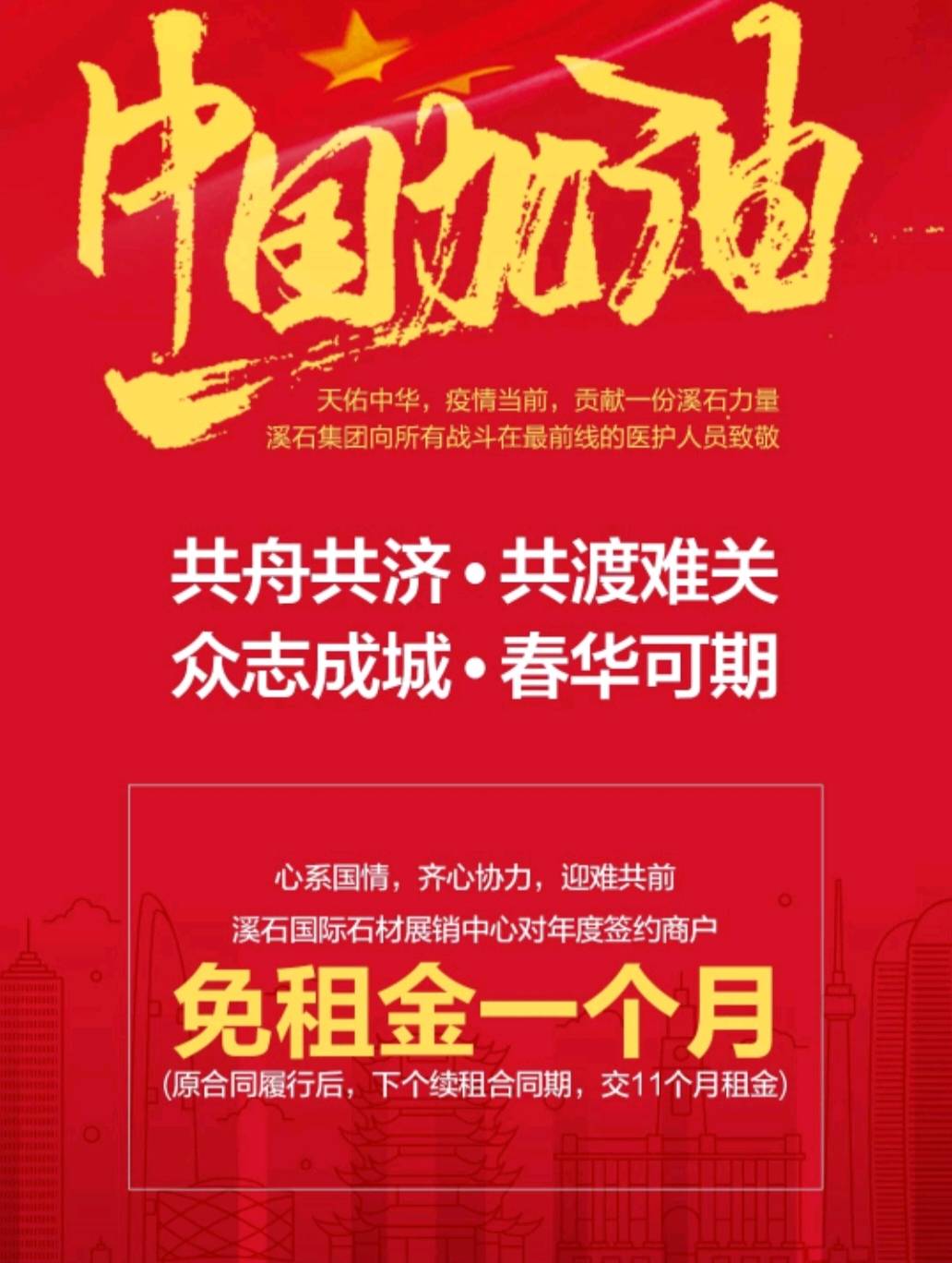 發(fā)布信息: [強(qiáng)][強(qiáng)]天佑中華,疫情當(dāng)前,貢獻(xiàn)一份溪石力量 溪石集團(tuán)向所有戰(zhàn)斗在前線的醫(yī)護(hù)人員致敬! 同舟共濟(jì),共渡難關(guān),眾志成城,春華可期! 溪石國(guó)際石材展銷中心對(duì)年度簽約商戶 免租金一個(gè)月[強(qiáng)][強(qiáng)]