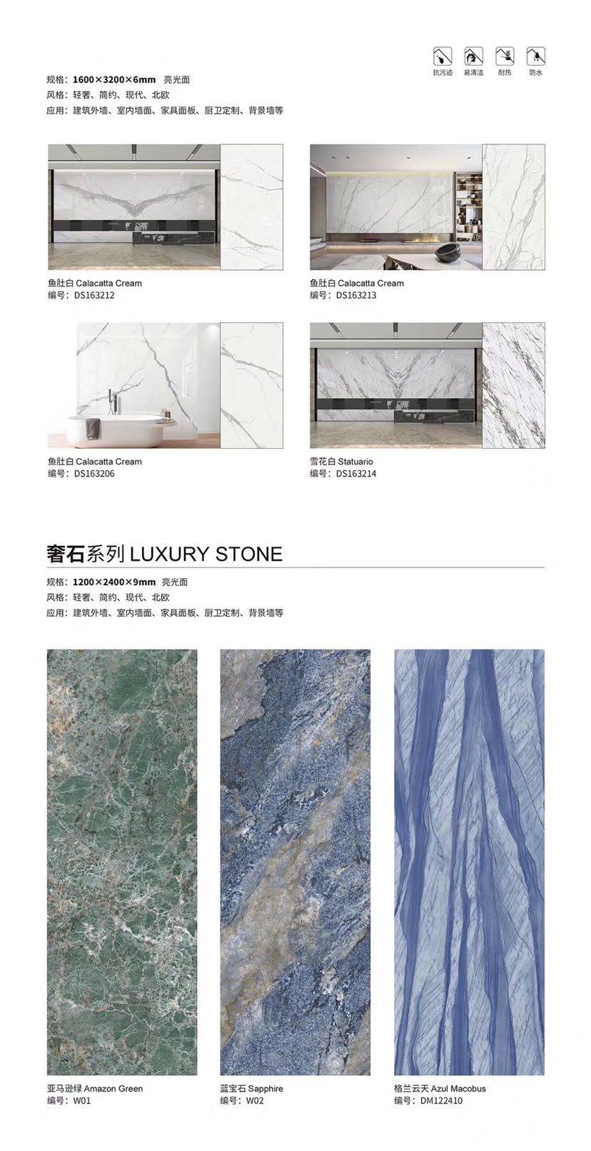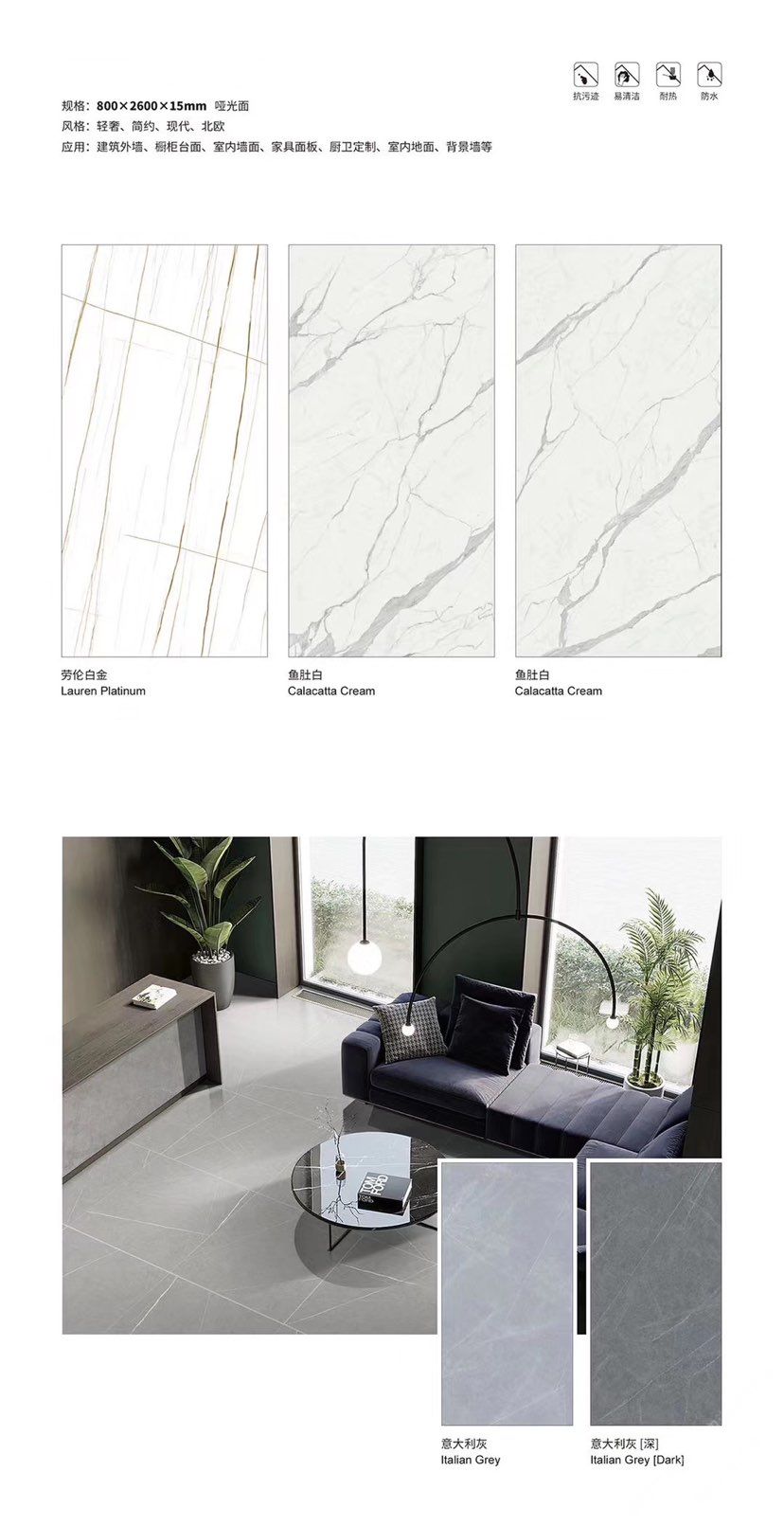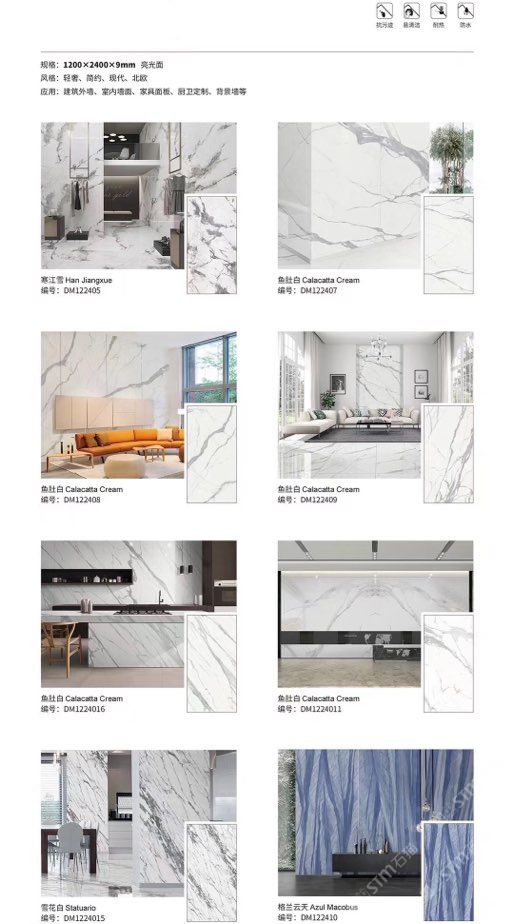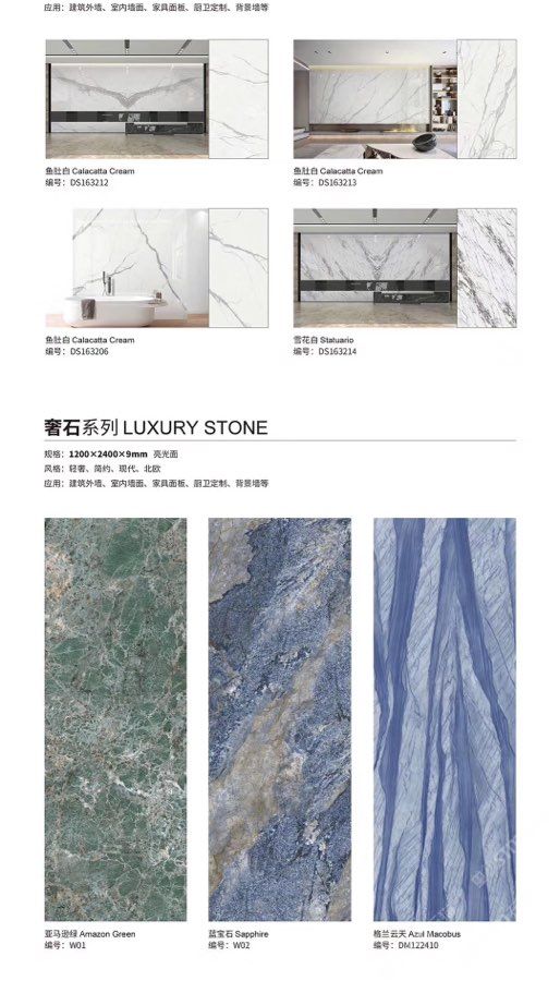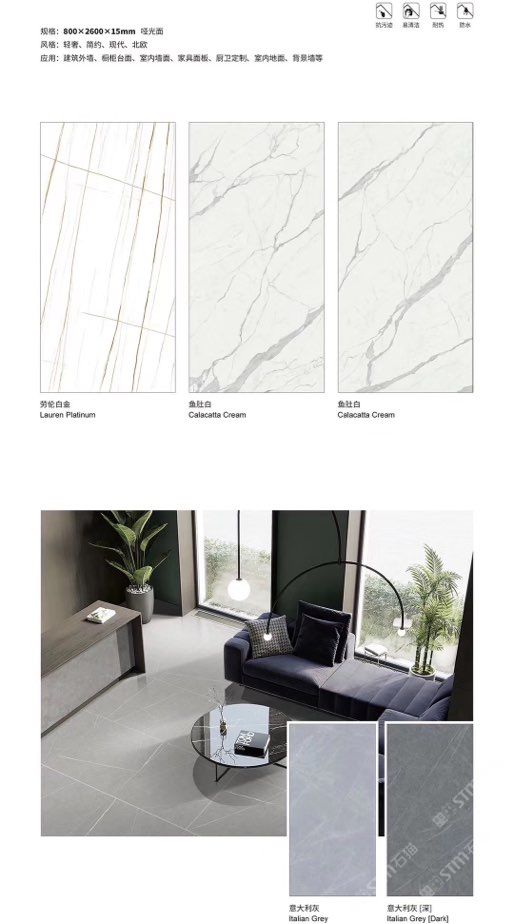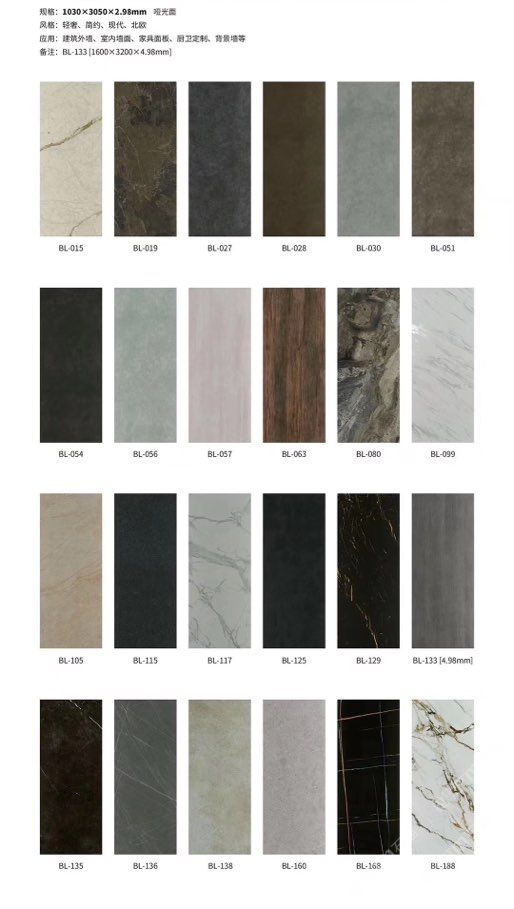 發(fā)布信息: ????SIBELAN 斯貝納巖板???? ????意大利設(shè)計(jì)師精選巖板???? 我們可以幫老總您加工為成品, 全國(guó)范圍內(nèi)可安排專業(yè)團(tuán)隊(duì)安裝. 做到您一次性采購(gòu) 省心. 放心. 省時(shí). 低價(jià)! 巖板紋路版面全多達(dá)199 款 勵(lì)志做服務(wù)五星的巖板專業(yè)供應(yīng)商 魚肚白 雪花白 格蘭云天 寒江雪 爵士白 幻影灰 勞倫黑金 火山灰 亞馬遜 艾維拉 羅馬黑檀 貝特巖 細(xì)花白 羅馬灰 云朵拉灰 魚肚金 莎羅娜 莎羅蘭 勞倫白金 拉薩白 中花白 灰冰玉 卡拉拉白 撒金黑 清水玉 薩瓦灰 莎士比亞 大花灰 白冰玉 銀灰洞 阿瑪尼灰 綠紋玉 綠冰玉 藍(lán)紋玉 保加利亞灰 鐵銹 黑木紋 流砂灰 純白 純灰 純黑 TEL: 15905069590 聶 各種版面規(guī)格全部如下: 1200×600×11mm 啞光 1500×800×11mm 啞光 1800×900×11mm 啞光 1800×900×12mm 啞光 2600×800×15mm 啞光 2400×1200×6mm 啞光/亮光 2400×1200×9mm 啞光/亮光 2400×1200×15mm 啞光 2700×1200×6mm 啞光/亮光 2700×1600×12mm 啞光/亮光 3200×1600×6mm 啞光/亮光 3200×1600×12mm 啞光/亮光