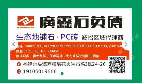 廣鑫石英磚/PC磚 聯(lián)系人:劉    134****2000 查看 手機號碼:無 主營范圍: 花崗巖加工、石材外貿(mào)、更多、環(huán)境石材、大理石加工、 企業(yè)地址:福建泉州福建省泉州市南安市水頭鎮(zhèn)海西石材城海五路1-81\\n