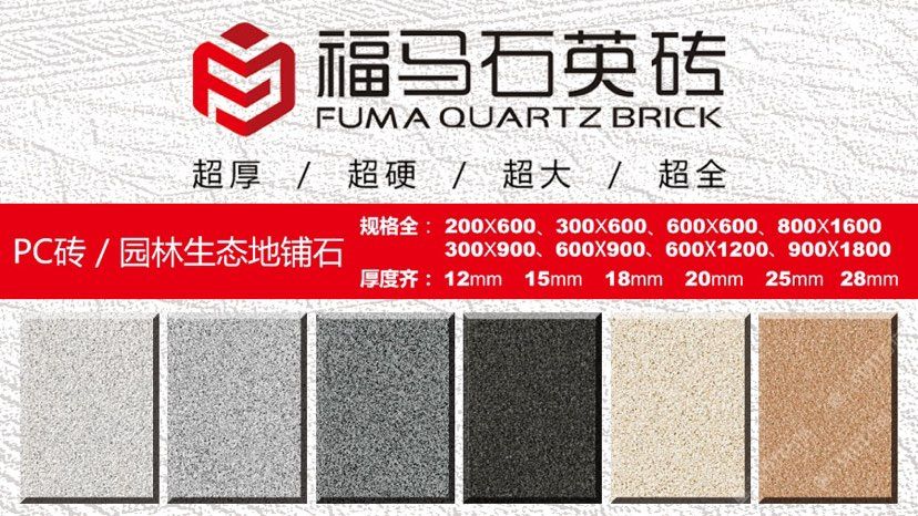 發(fā)布信息: ??福馬石英磚 強(qiáng)勢(shì)推出多種規(guī)格與厚度,并有荔枝面、火燒面、自然面等不同表面處理工藝的石英磚/PC磚產(chǎn)品;產(chǎn)品具有色彩艷麗、光潔度高、顏色均勻,抗壓耐磨、韌性好、致密度高、堅(jiān)固耐用、比重輕、超低吸水率、防污防滲、耐侵蝕風(fēng)化、不褪色、放射性低等優(yōu)點(diǎn),是園林地鋪及外墻干掛的一類裝飾材料。