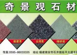 樹(shù)奇景觀石材主營(yíng)產(chǎn)品:福建青,漳浦青G612,臺(tái)灣青,森林綠,紅斑巖,綠斑巖,紫斑巖,壽寧紅,紅砂巖,蝴蝶綠,銹石,黃金麻,菊花黃,皇室香檳(老礦),老石板(舊石板)企業(yè)地址:福建泉州南安市石井鎮(zhèn)延平大道豐隆加油站旁