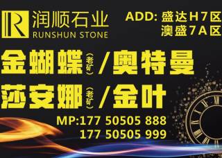 潤順石業(yè)主營產(chǎn)品:奧特曼(旺程礦),莎安娜(老礦),莎安娜米黃,莎安娜米黃(白沙糖底),奧特曼,現(xiàn)代灰,愛瑪仕灰,雅士白企業(yè)地址:福建泉州南安市荷北路澳盛市場10棟2區(qū);盛達市場h7區(qū)